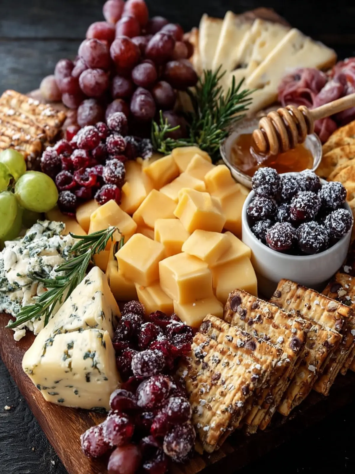 • Cranberries: Fresh or dried, they provide a pop of color and a sweet-tart contrast to the creamy cheeses.
