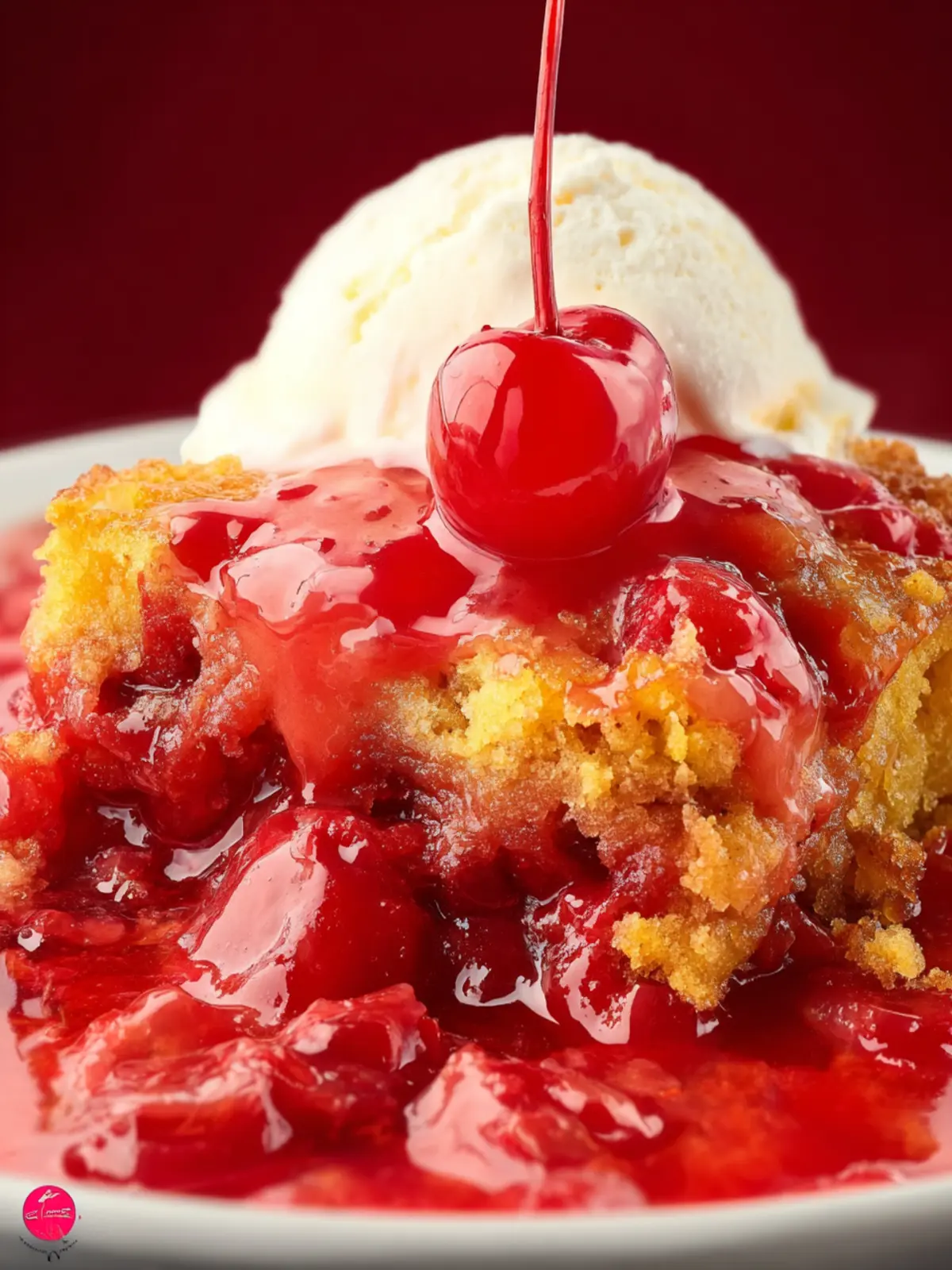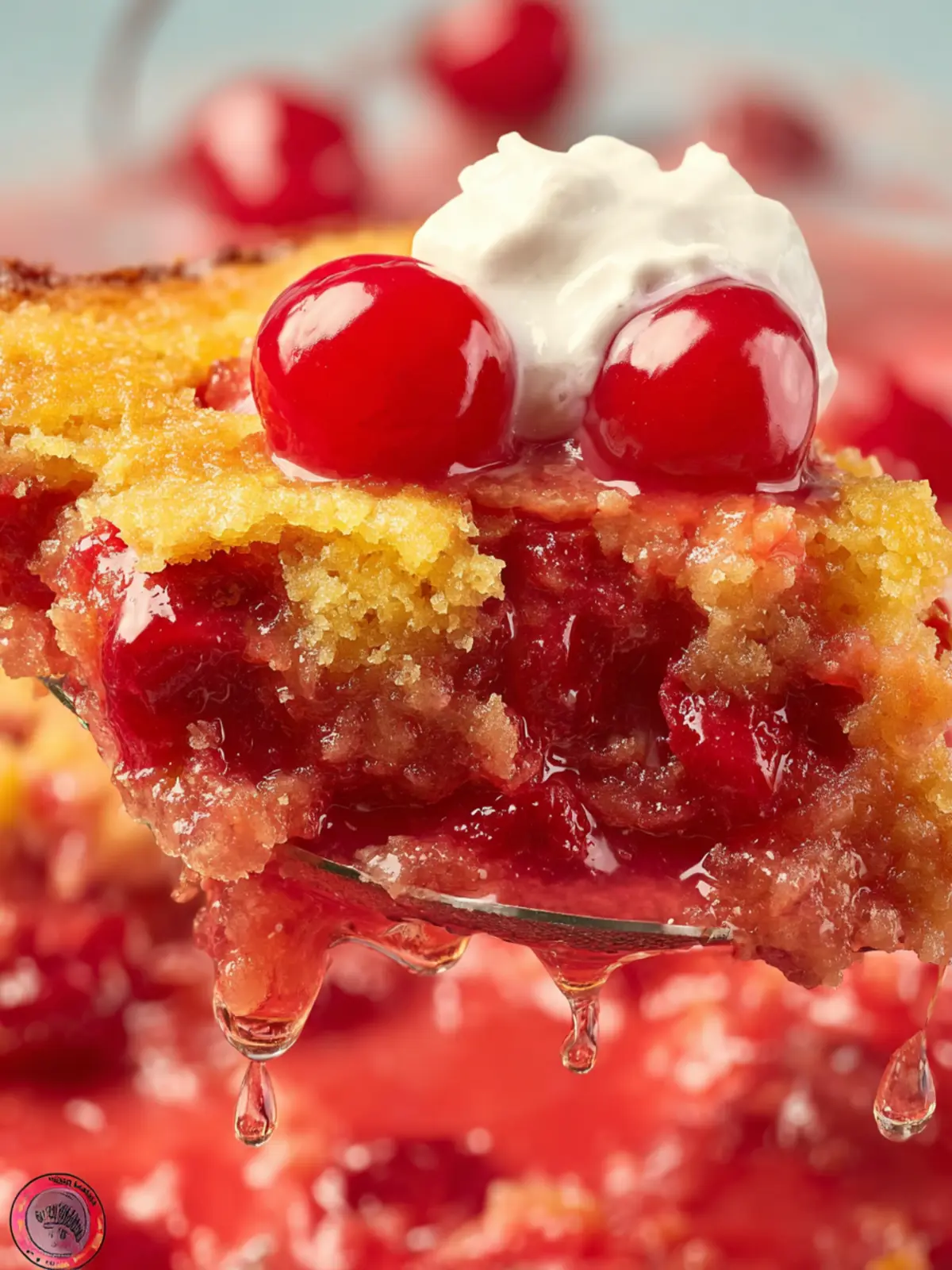 A delicious and easy cherry dump cake made with cherry pie filling, yellow cake mix, and 7-Up.