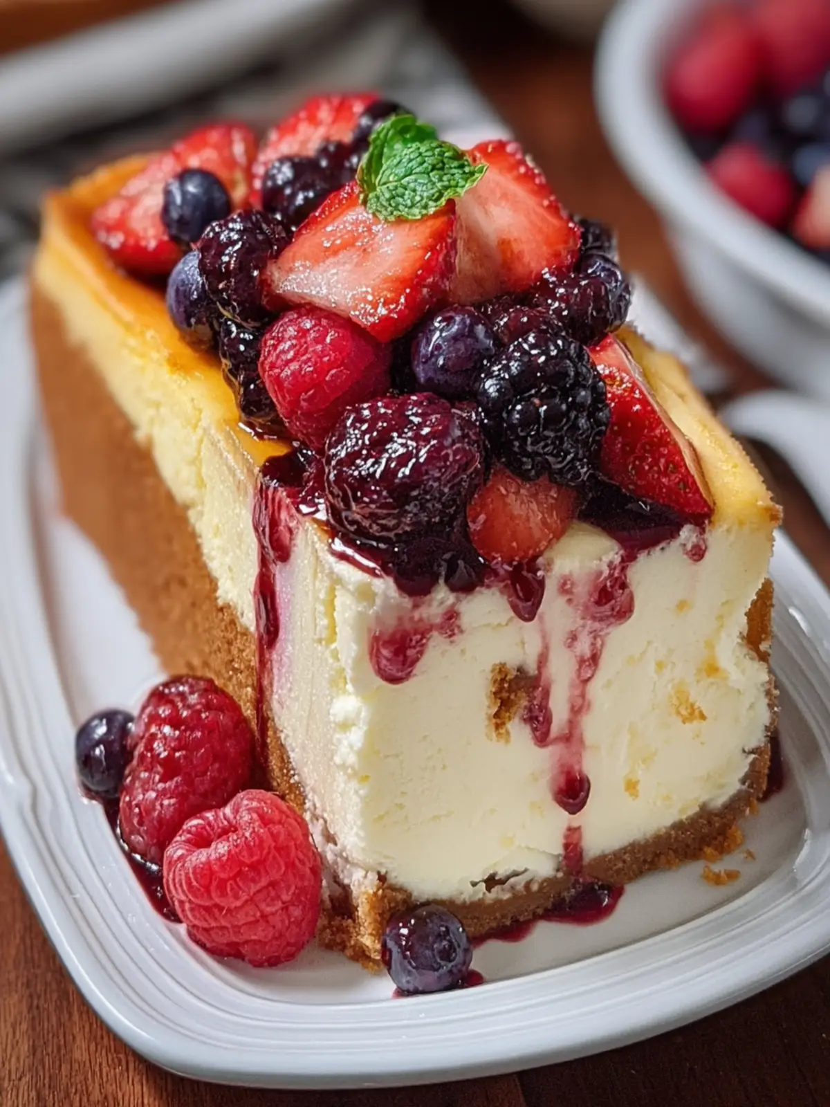 This creamy cheesecake topped with fresh berries is a delightful dessert for any occasion.