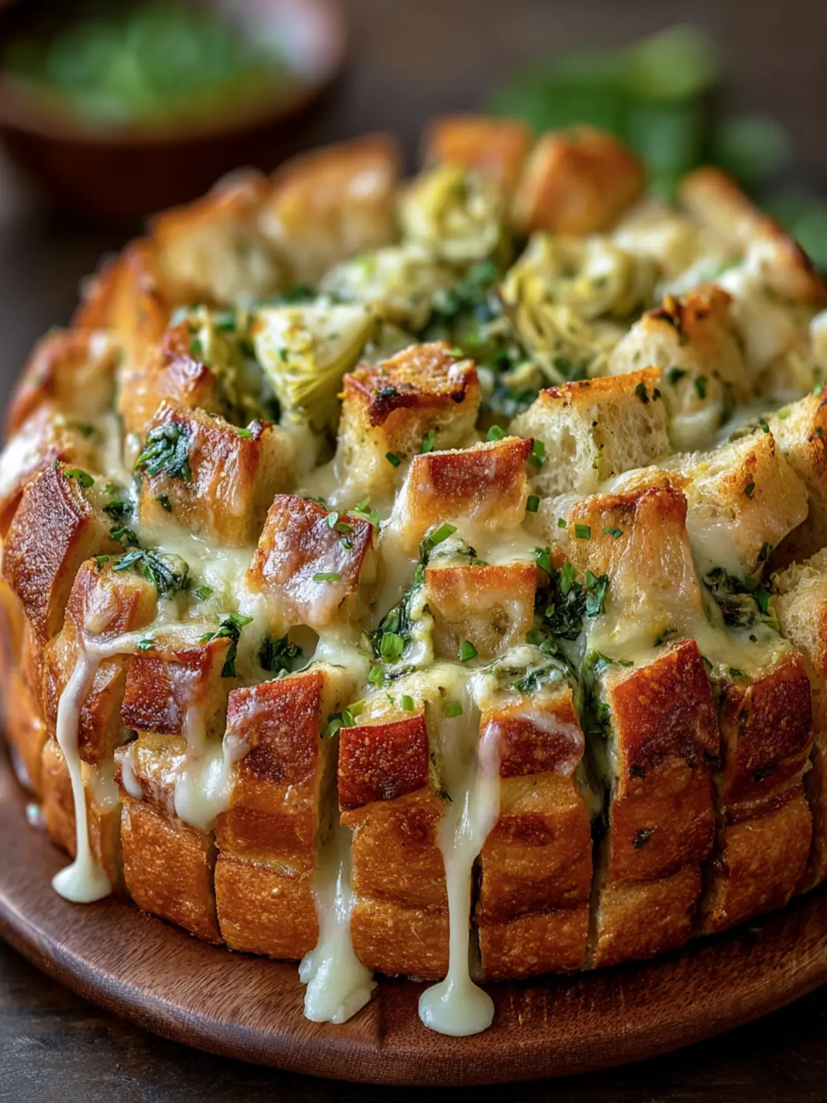 A delicious cheesy bread filled with spinach and artichokes, perfect for gatherings!