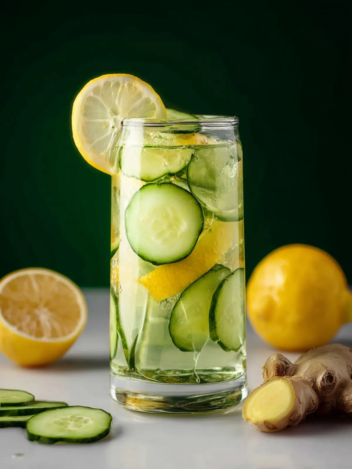 Lemon: The tangy brightness of fresh lemon cuts through the richness of ginger and enhances the refreshing qualities of cucumber. Rich in vitamin C, lemons are your go-to for immunity support, making this beverage not just refreshing but also beneficial during flu season.
