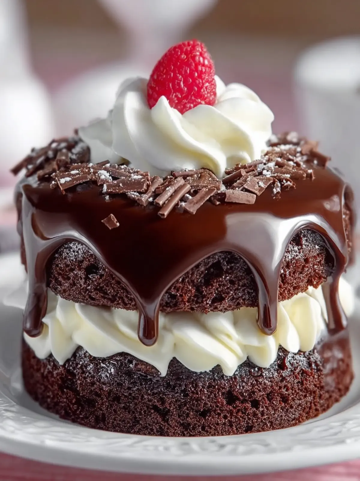 6. Place one cake layer on a serving plate. Spread the whipped cream filling evenly over the top. Place the second cake layer on top. Pour the ganache over the top, letting it drizzle down the sides.