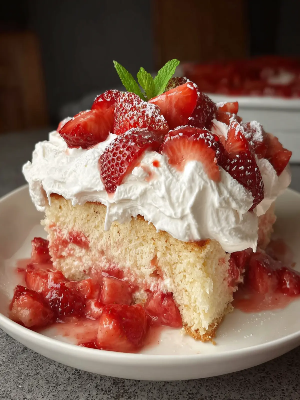 A delightful dessert featuring layers of cake soaked with strawberry cream and topped with fresh strawberries.