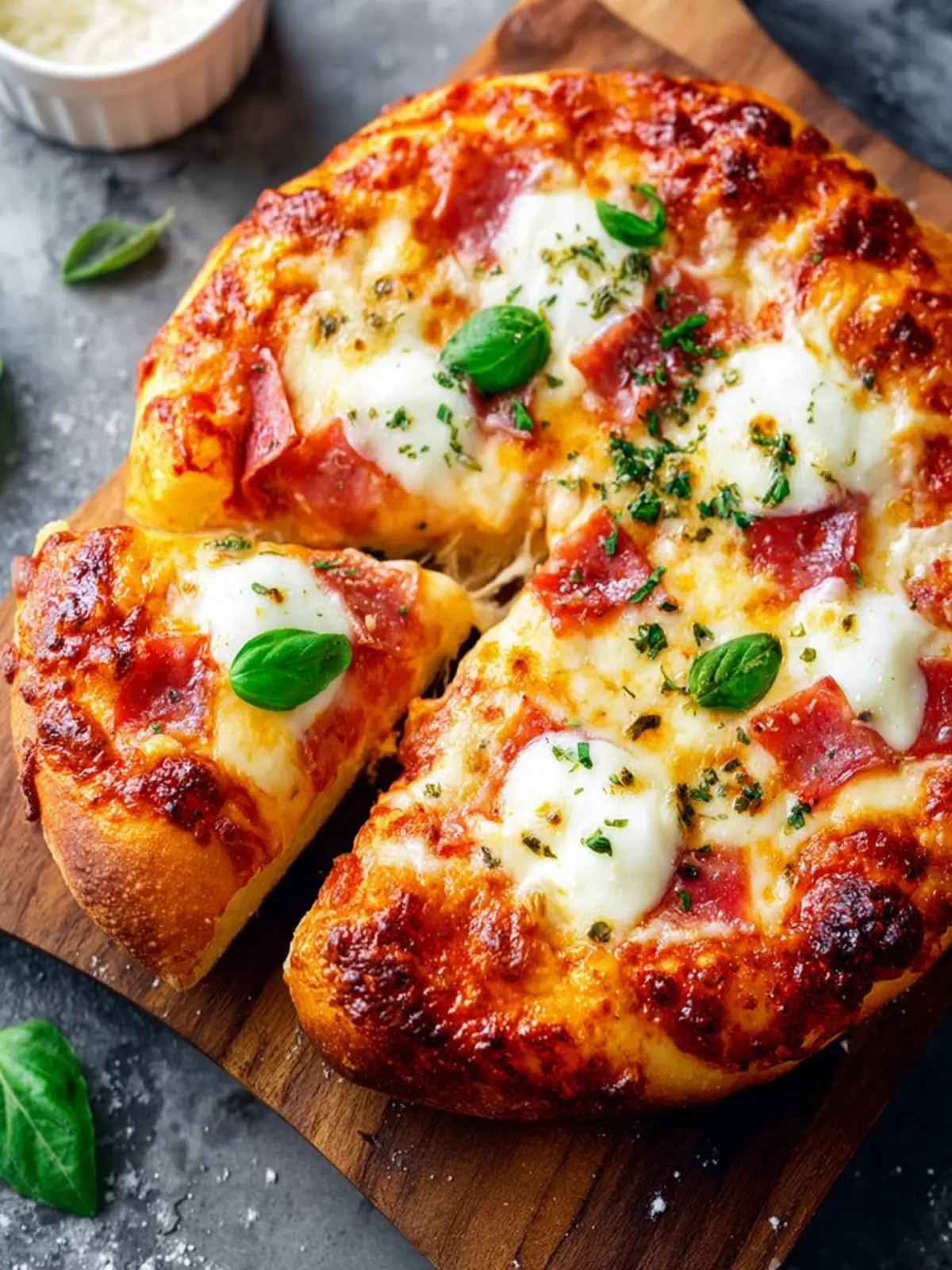 10. Allow the pizza to cool for a minute or two, then add fresh basil (if using), slice into pieces, and serve immediately.