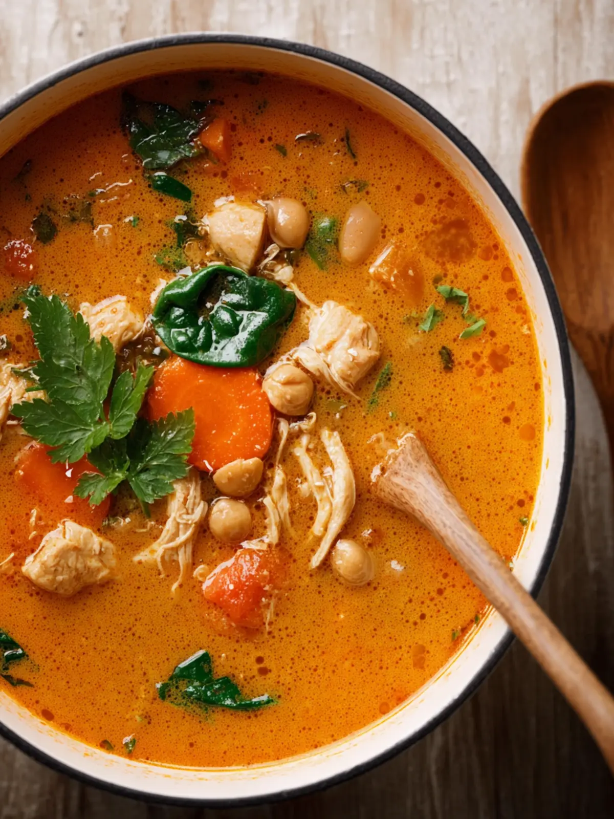 Throw in some fresh greens, such as kale or spinach, for a nutrient boost. They’ll wilt nicely and add color and freshness to your peanut butter chicken soup without overpowering the flavors.