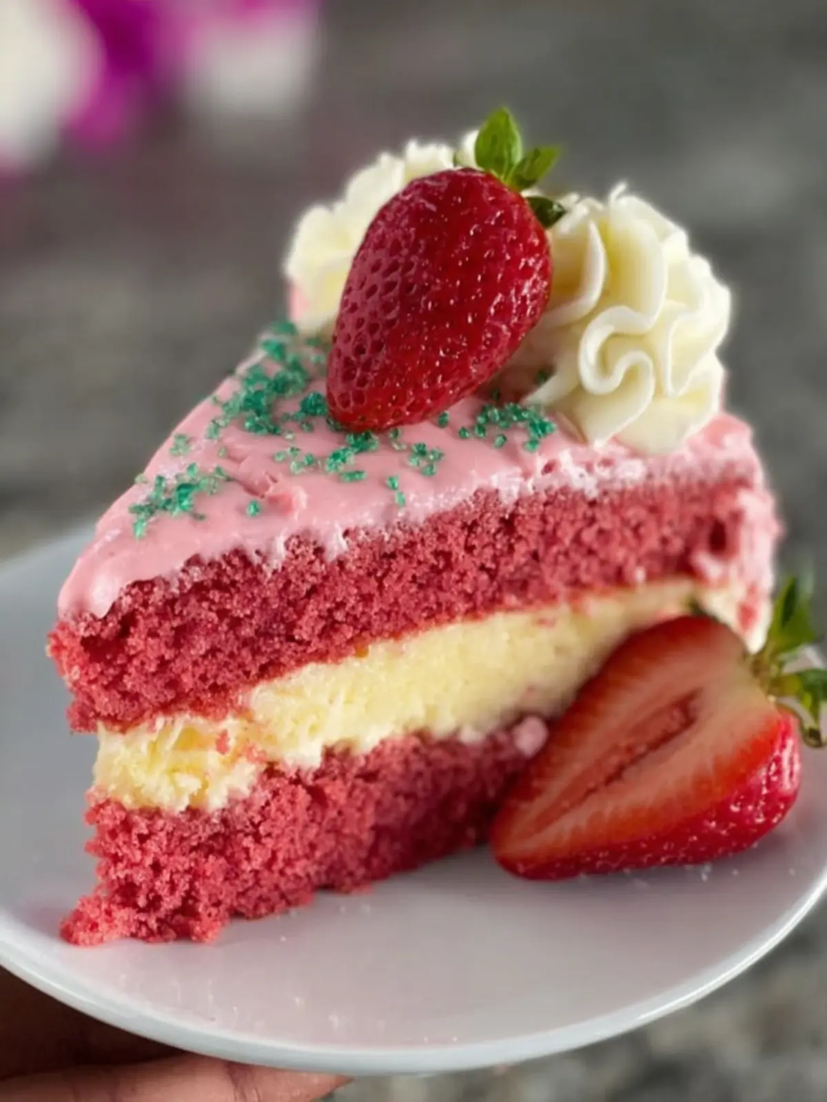 Fresh Strawberries: To top it all off, fresh strawberries not only add a burst of color but also act as a refreshing, fruity garnish. They’re the cherry on top of your gorgeous strawberry pink velvet cake slice.